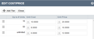 - Enter a Unit Cost and Unit Price for the "unlimited" tier. The unlimited tier is either your only, or your lowest-priced tier.